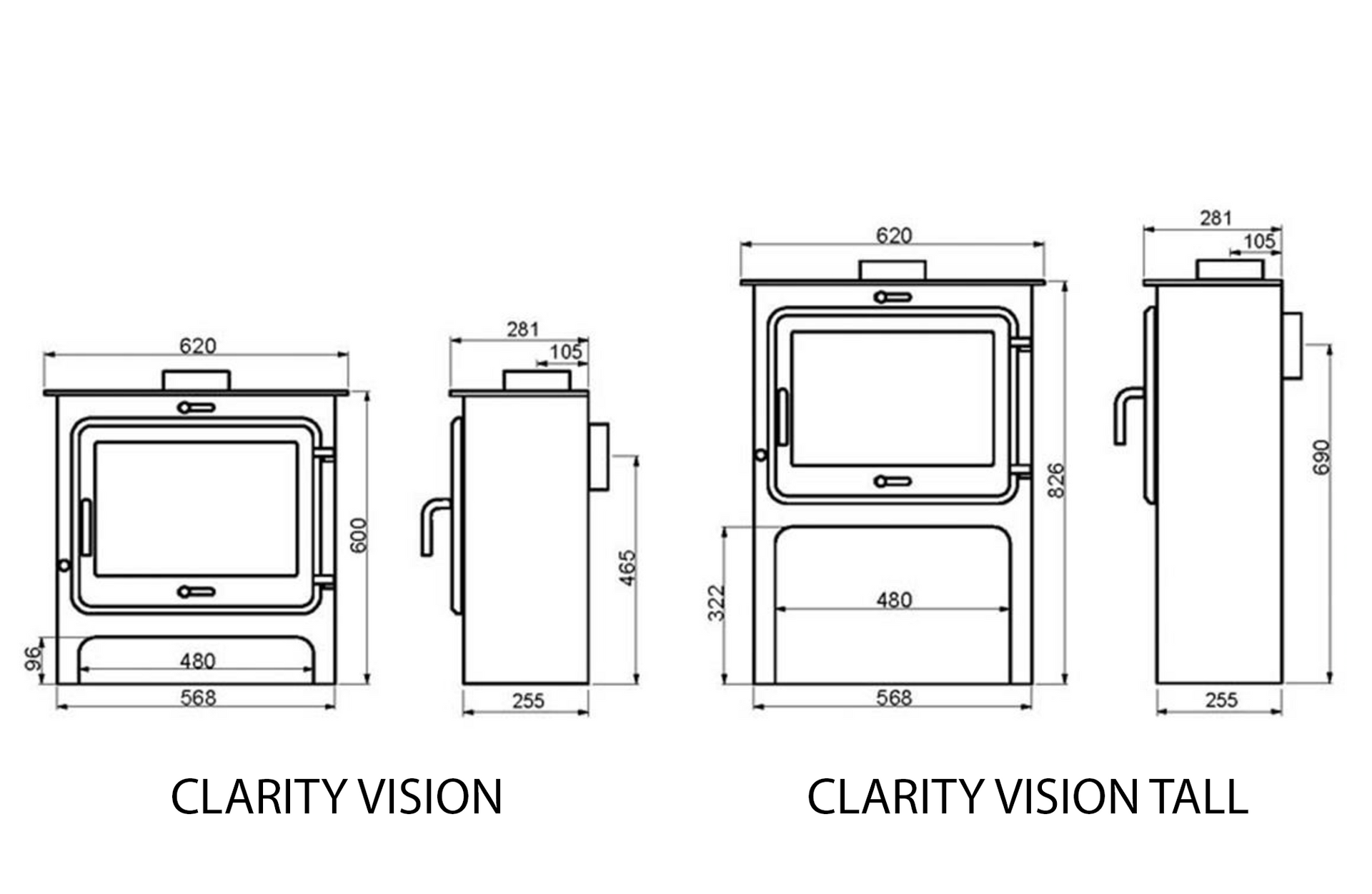 Clarity Vision Multi-fuel version £1,299. Clarity Vision Woodburner High £1,299, Multi-fuel Tall version £1,499.