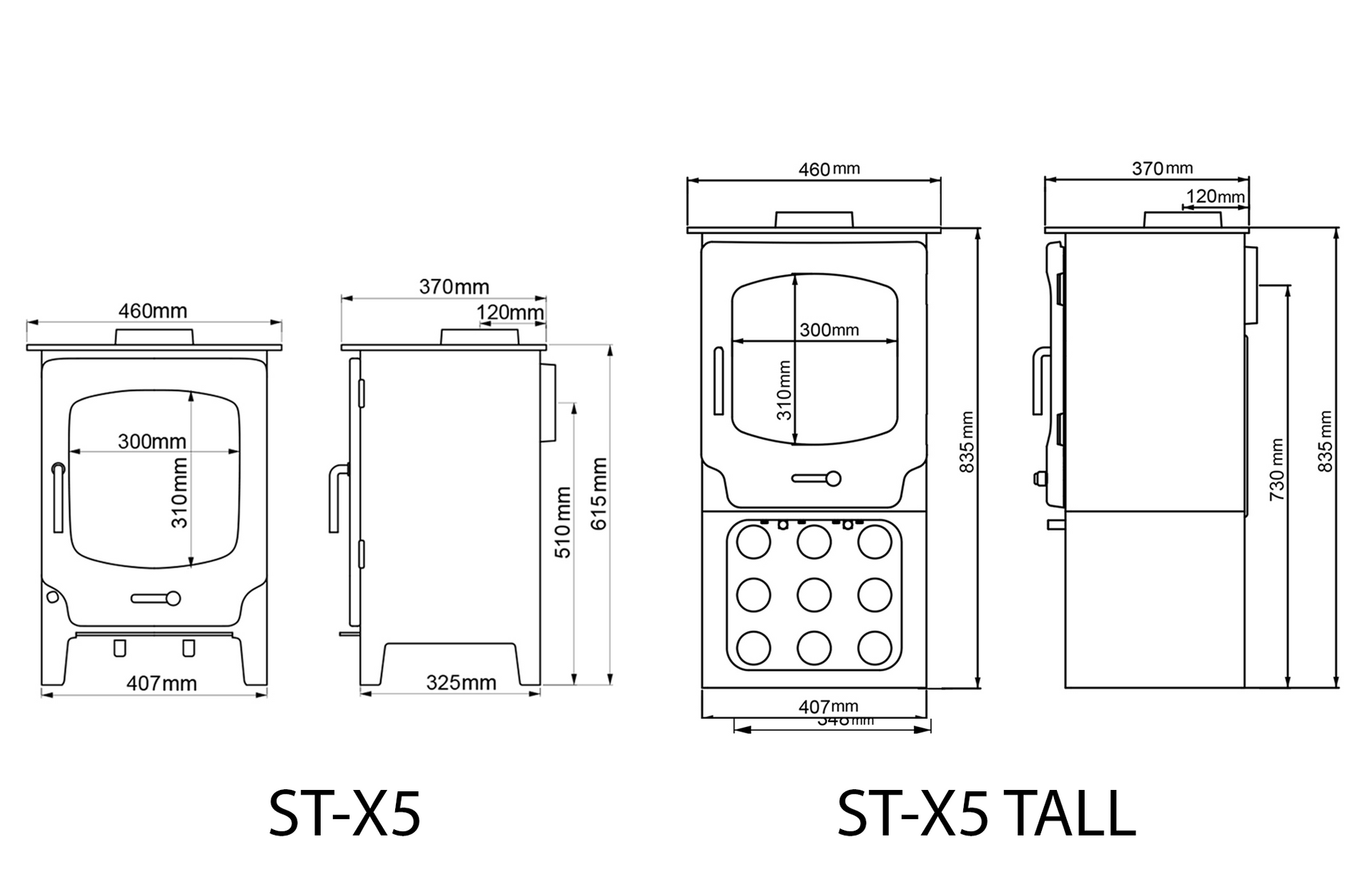 The ST-X5 has a 5"(125mm) diameter top and rear flue outlet. Can be used with 5" diameter flue liner or twinwall flue.